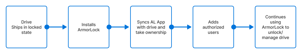 ArmorLock drives currently ship in a locked state. The default state of the drive is locked, every time the drive is plugged in, it will be locked. In order for the drive to be unlocked a user needs to have authorization to the drive. The initial setup of the drive is done using take ownership flow. This syncs the AL app with the drive and allows the user(Manager) to unlock/lock and authorize additional users/managers.