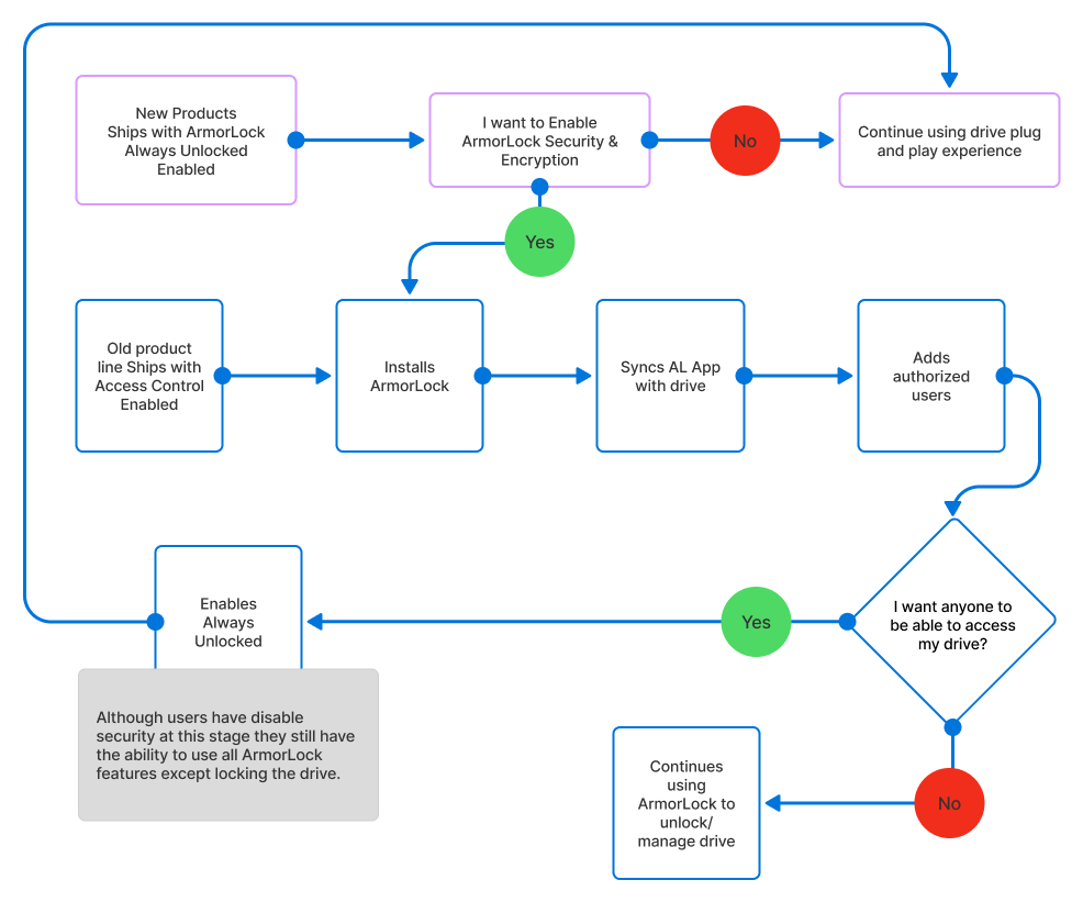 In order to preserve the plug and play experience of our new SSD products and incorporate the ability to use AL technology into these new drives. We would need to ship the drives in the unlocked state. This would require another entry point into our onboarding flow. As well as an exit point for users choosing to return the drive to the unlocked state.